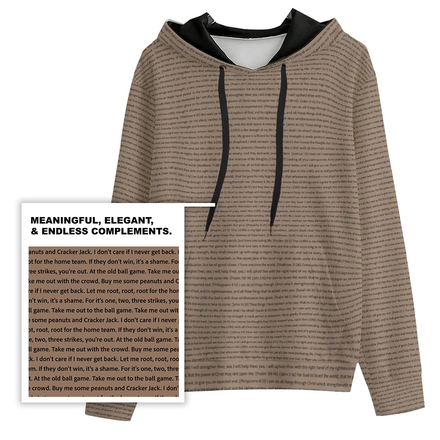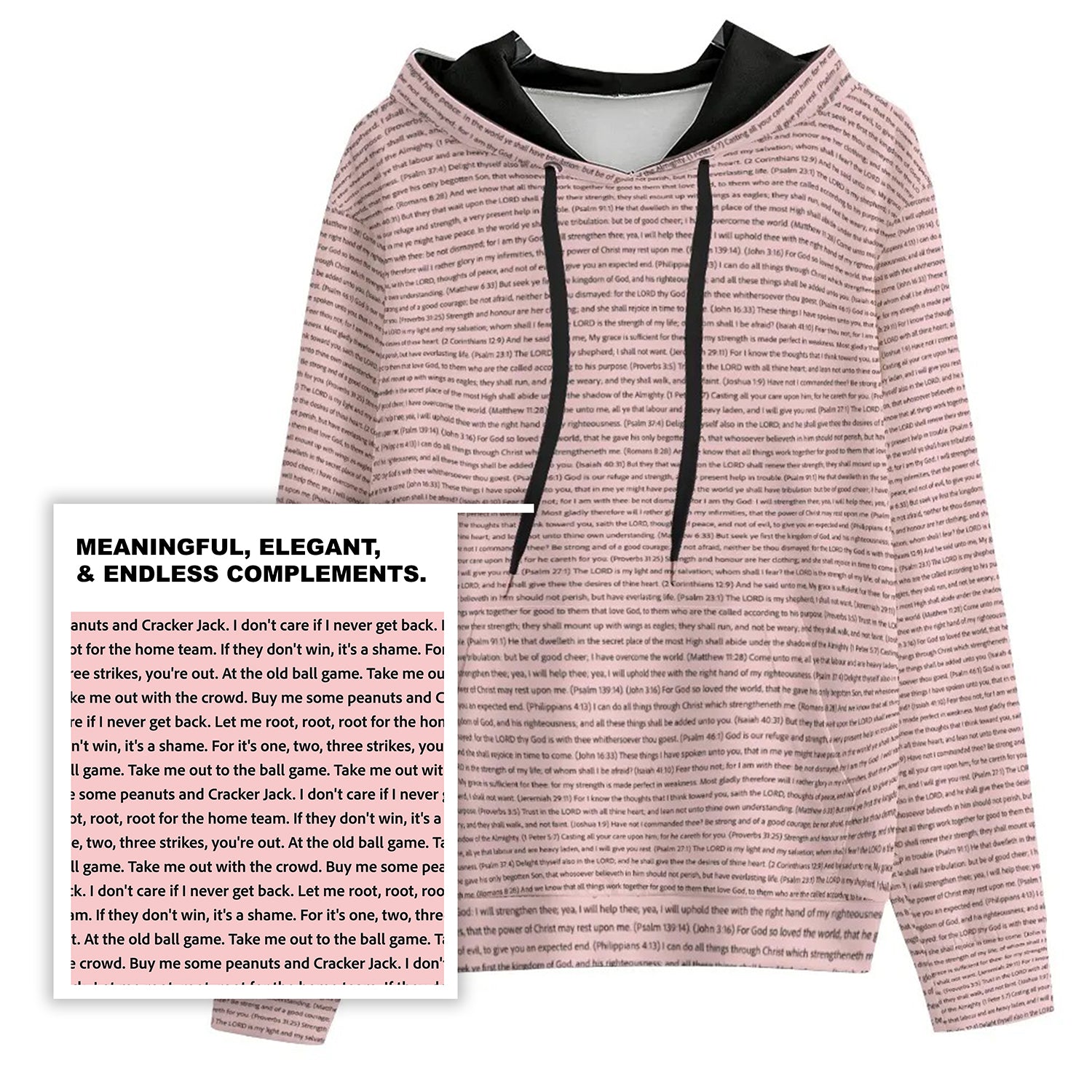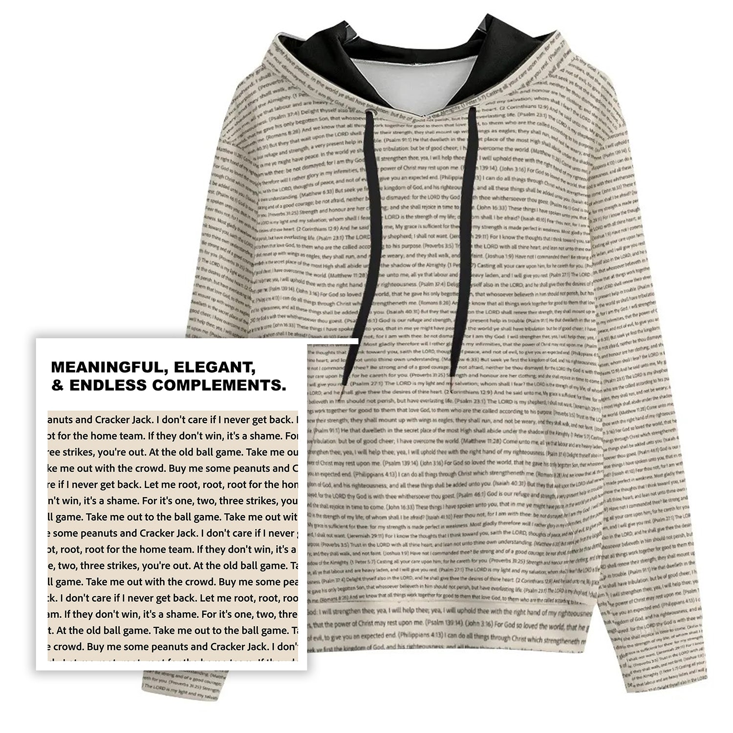 Song lyrics, verses, or text printed clearly across the hoodie.
